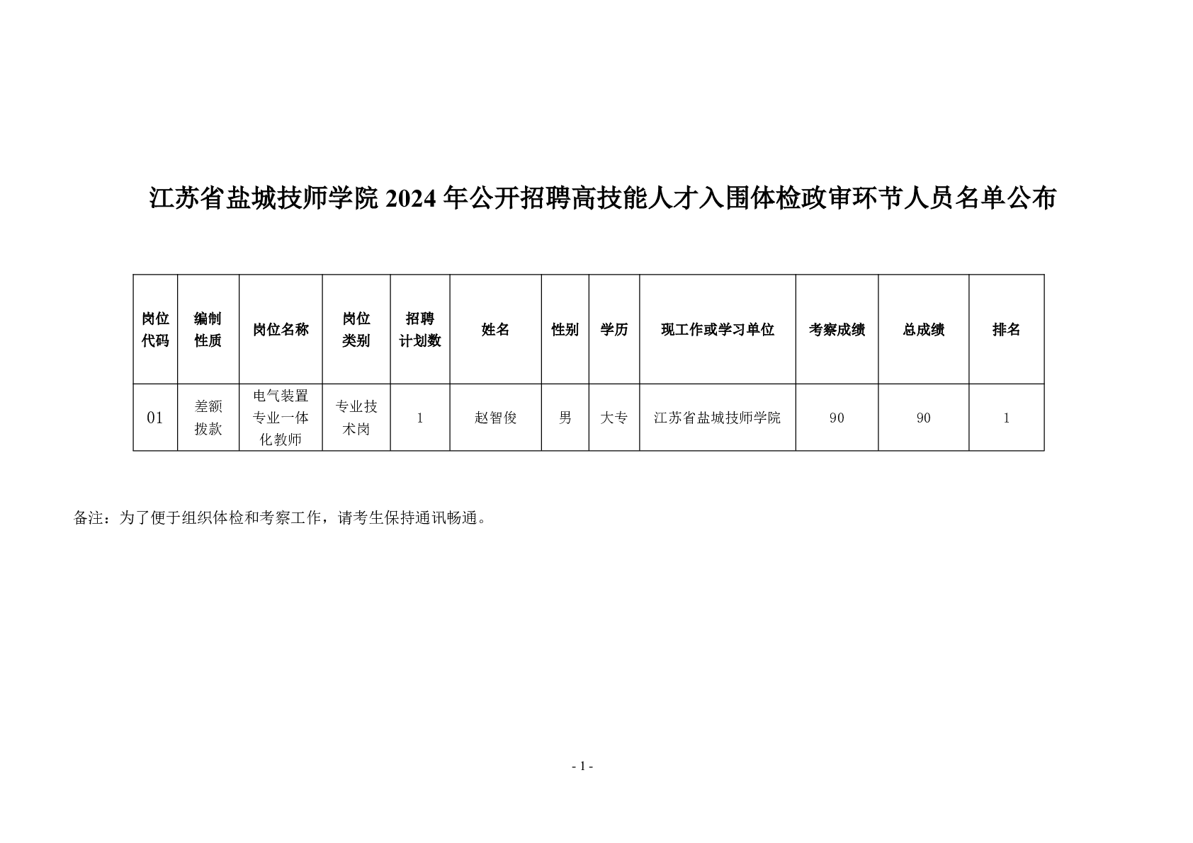 江蘇省鹽城技師學院2024年公開招聘高技能人才入圍體檢政審環(huán)節(jié)人員名單公布