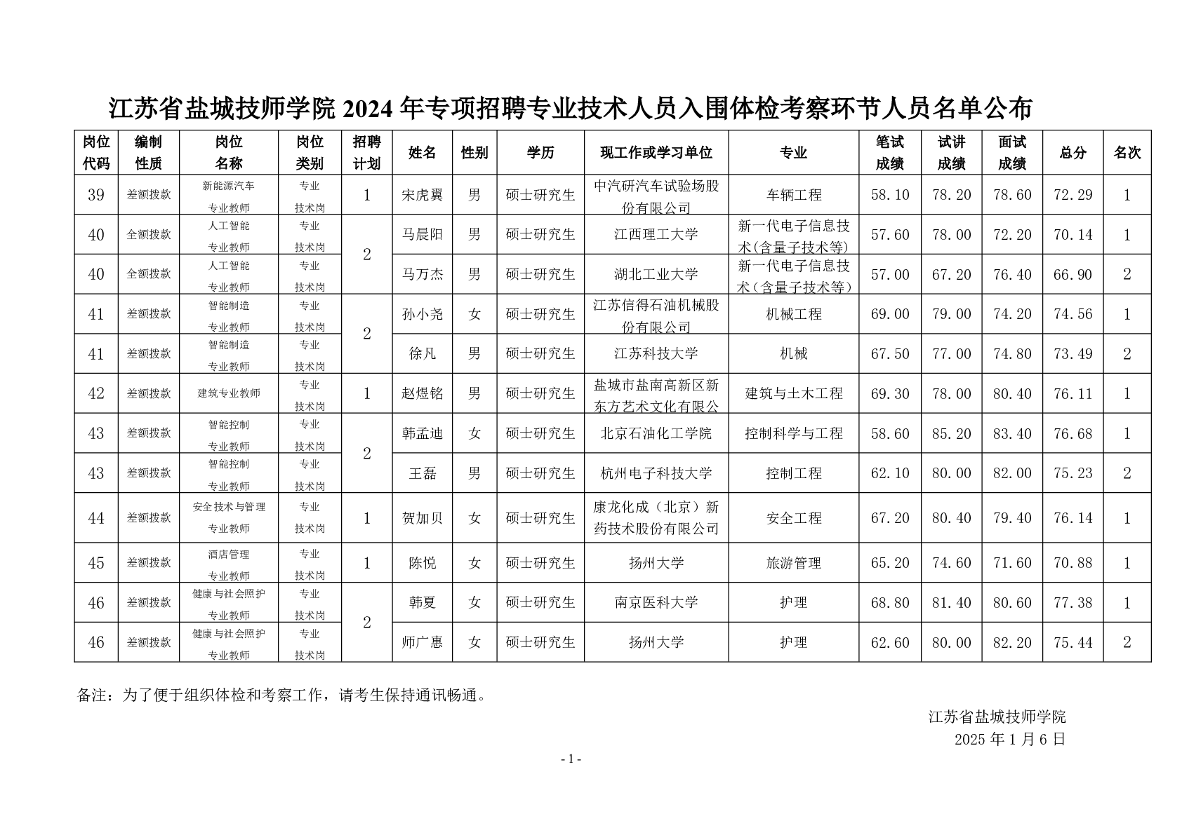 江蘇省鹽城技師學院2024年專項招聘專業(yè)技術(shù)人員入圍體檢考察環(huán)節(jié)人員名單公布