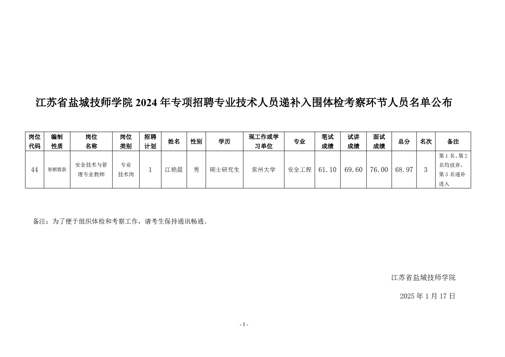 江蘇省鹽城技師學(xué)院2024年專項(xiàng)招聘專業(yè)技術(shù)人員遞補(bǔ)入圍體檢考察環(huán)節(jié)人員名單公布