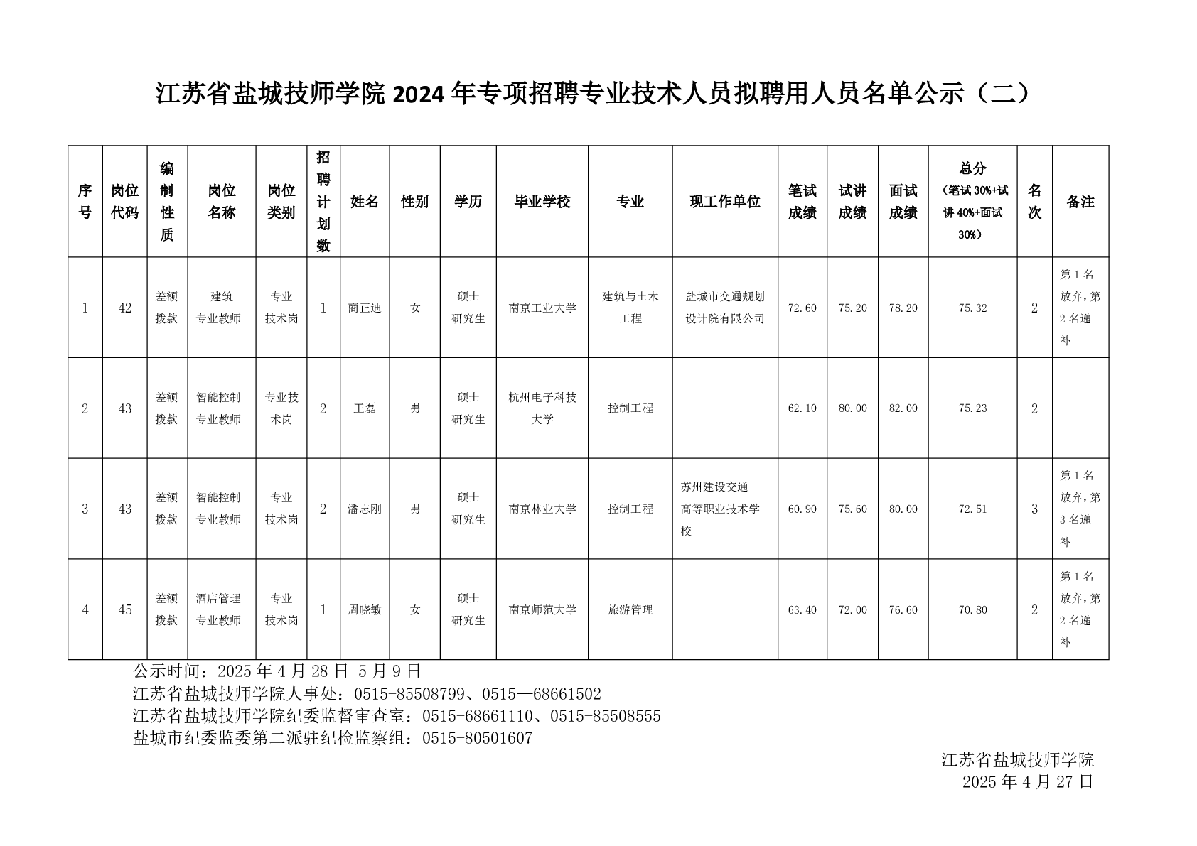 江蘇省鹽城技師學(xué)院2024年專項(xiàng)招聘專業(yè)技術(shù)人員擬聘用人員名單公示(二)