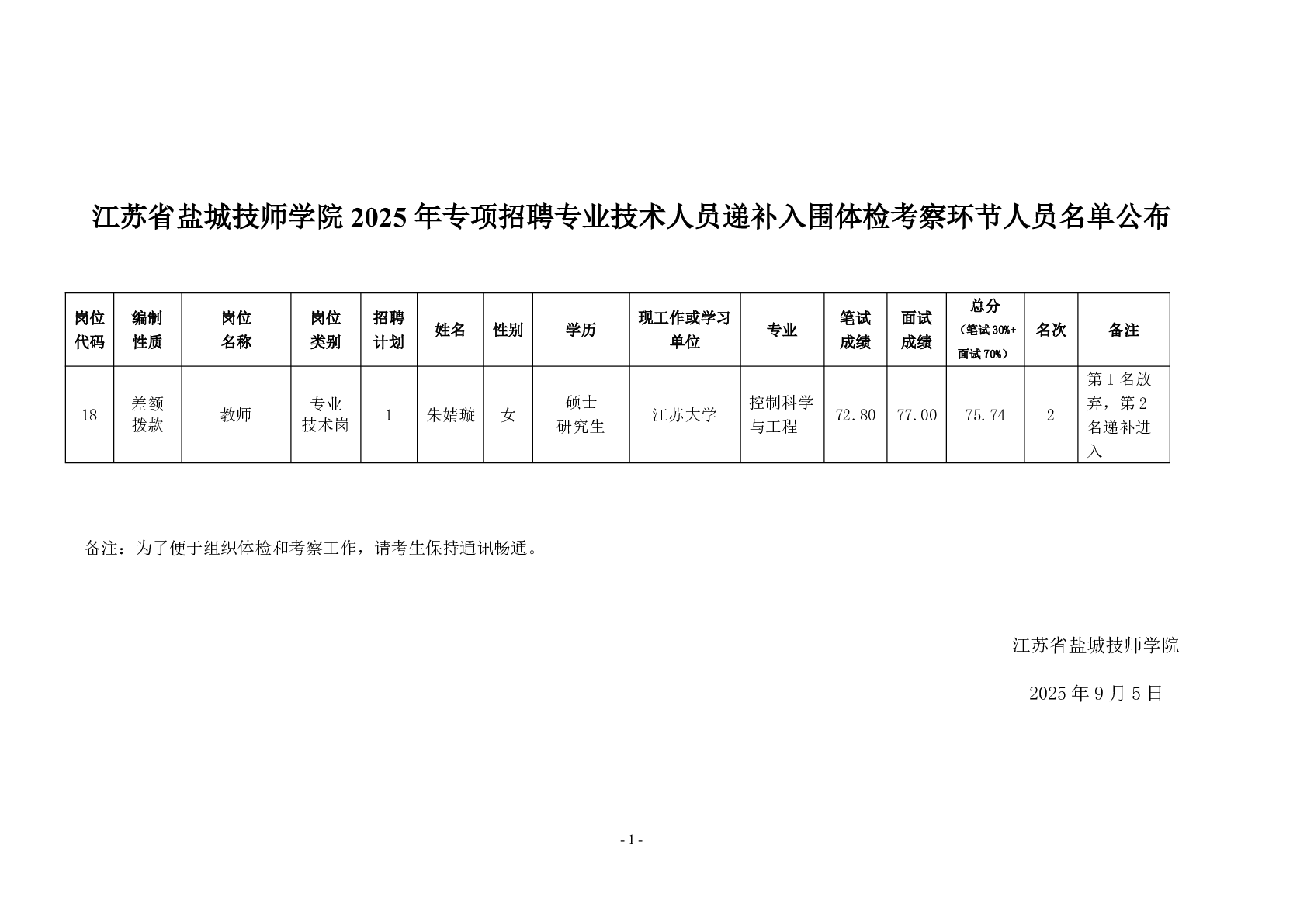 江蘇省鹽城技師學(xué)院2025年專項(xiàng)招聘專業(yè)技術(shù)人員遞補(bǔ)入圍體檢考察環(huán)節(jié)人員名單公布